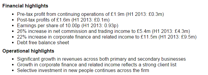 Interim results - to 30 Jun 2014 look jolly good to me. Although care is needed, as of course H1 of this year was a buoyant time for IPOs and Placings. So there's no guarantee Panmures will be able to repeat these figures. Here are the headline comments, which all sound good to me;