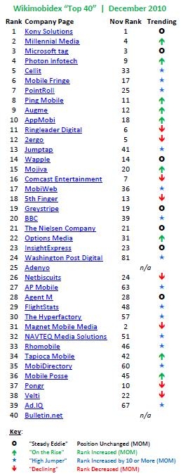 A clear testimonial to this fact can be found by looking no further than Wikimobidex’s December listing of the top 40 mobile companies to watch. Wikimobidex is a Web-based index of mobile marketing and advertising firms. According to their findings, here are the Top 40.